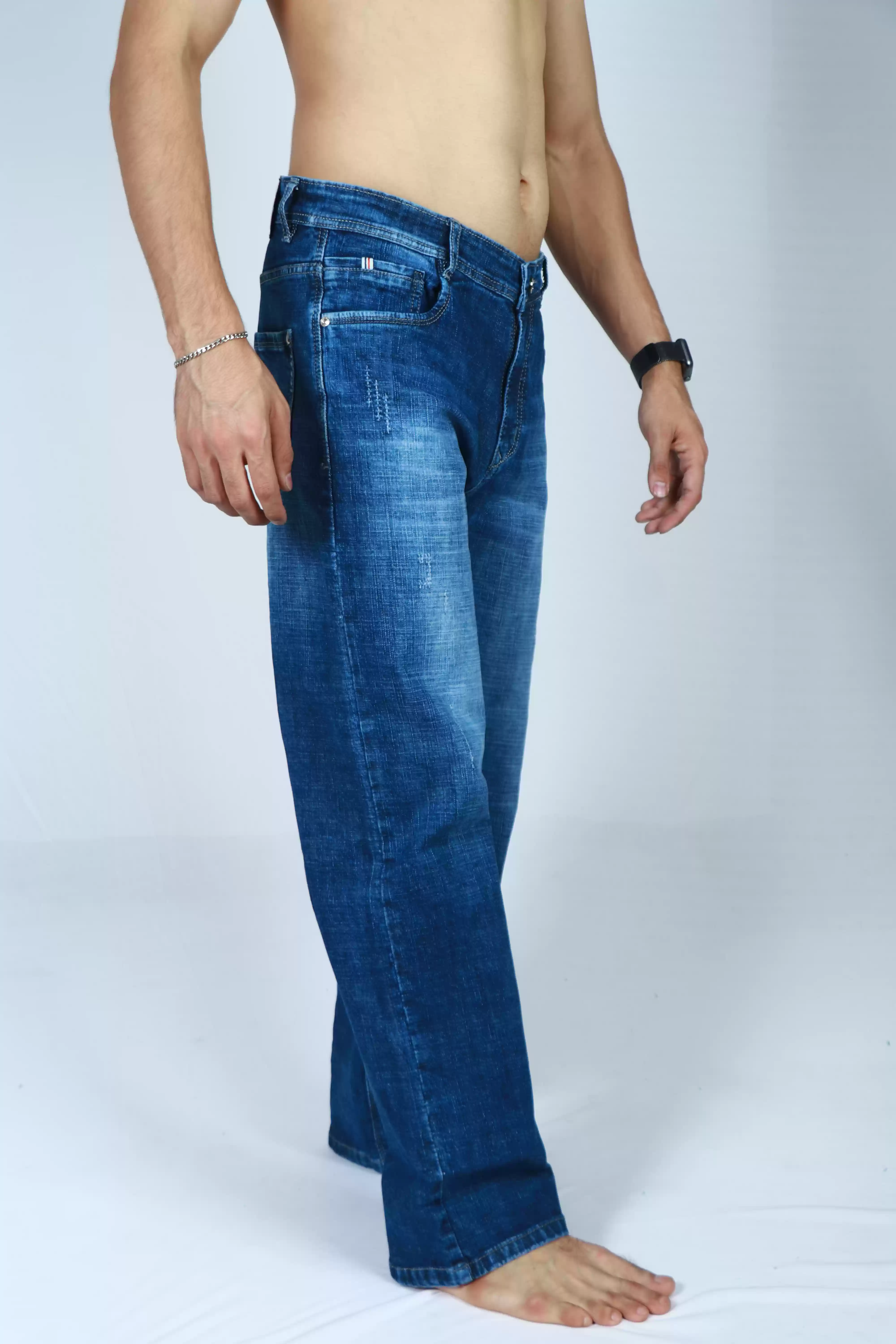 • Stylish medium blue denim wash